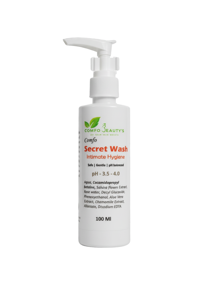Comfobeautys Secret Wash is a gentle and refreshing intimate wash designed to maintain hygiene and pH balance. Formulated with soothing and natural ingredients, it helps to cleanse, prevent odor, and promote comfort throughout the day. Ideal for sensitive areas, it leaves you feeling fresh, confident, and protected.